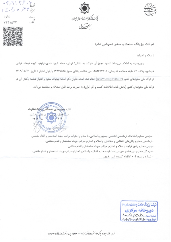 اخذ مجوز فعالیت پنجساله از بانک مرکزی جمهوری اسلامی ایران، نقطه عطفی در مسیر رشد و بالندگی شرکت لیزینگ صنعت و معدن محسوب میشود و اعتبار و اطمینان مضاعفی برای مشتریان، سهامداران و شرکای تجاری آن به همراه دارد.